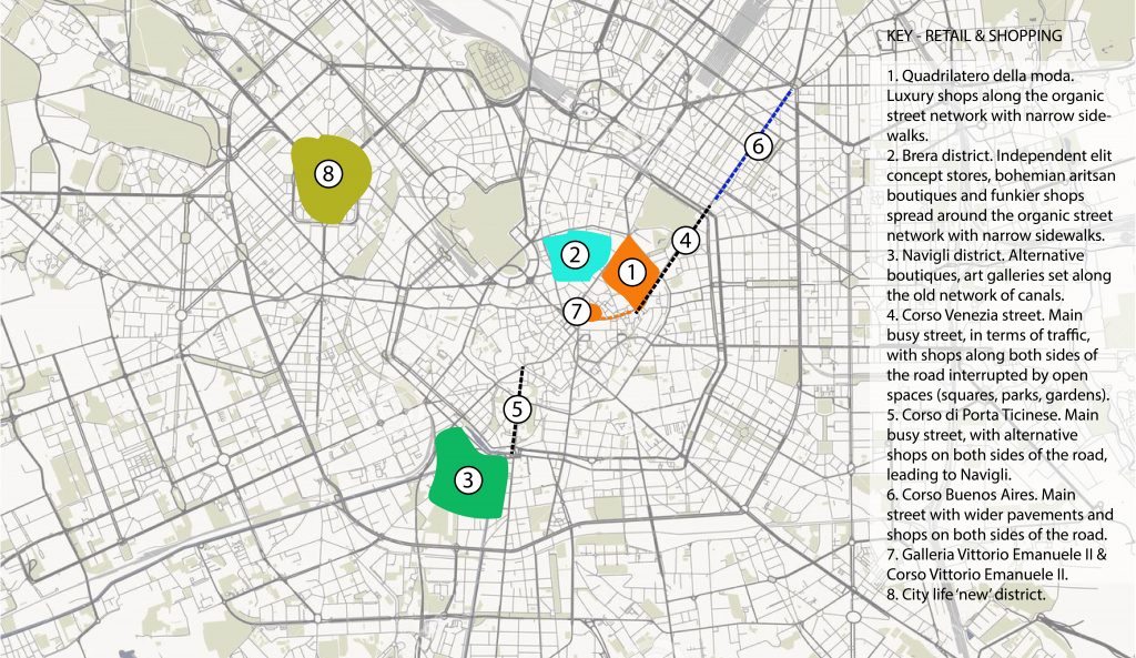 Due to this spread of the independent shops and the lack of signage in the city, the majority of the people tend to visit the commercial districts and streets to do their shopping. Even touristic guides suggest the same. However, Milan is the place to visit because of the independent shops. Therefore, the street network, the signage system and the city in general, need to focus more on highlighting these shops as part of the re-branded image.