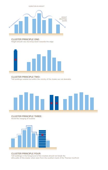 Canary Wharf is within the Tall buildings zone identified by the Tower Hamlets borough. However, there are certain principles that need to be followed, as shown in the diagram, providing guidelines on the appropriate height and location of the tall buildings in an area. In relation to the surroundings, high-rise development schemes are required to step down towards the edge of the zone in order to better integrate with the lower densities nearby.