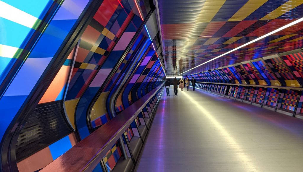 On-site evaluation: As already mentioned in the permeable network & active frontages paragraphs, there are wide pavements that facilitate flow and encourage walking, pedestrian bridges that provide connections with surrounding areas and an underground shopping mall that offers the possibility for car-free walks and shopping. All the above, encourage walking in the Canary Wharf area.