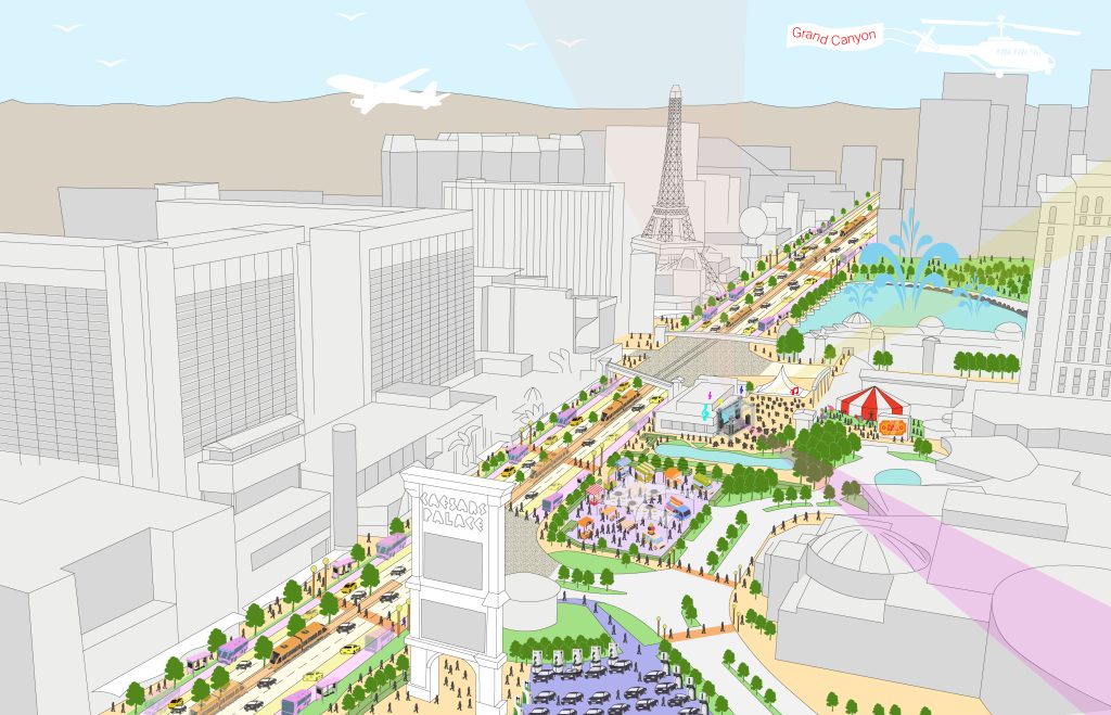 The sketch below is an illustration of the proposed ‘vibe’ and character of the Strip. I imagine a street that connects both sides and gives the impression of a compact place that allows people to easily go from point A to point B to point C and D and E throughout the day. A street that gives them options to either walk, take an uber, a bus, the tram to reach their destination whether that is a theatrical show, a music festival, a business conference, a trade event, the airport or the meeting point for the helicopter to take them to the Grand Canyon.